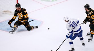 Pastrňák jako brankář! Chytil gól, předvedl i drtivý hit. Boston přesto padl